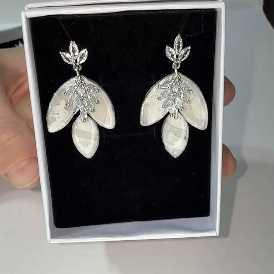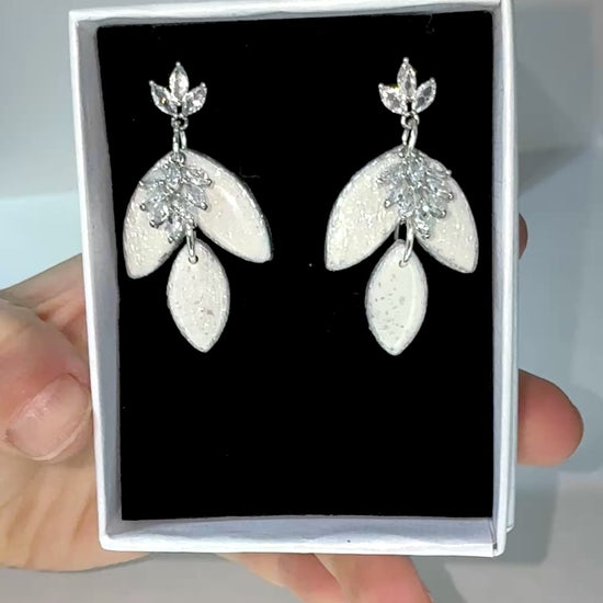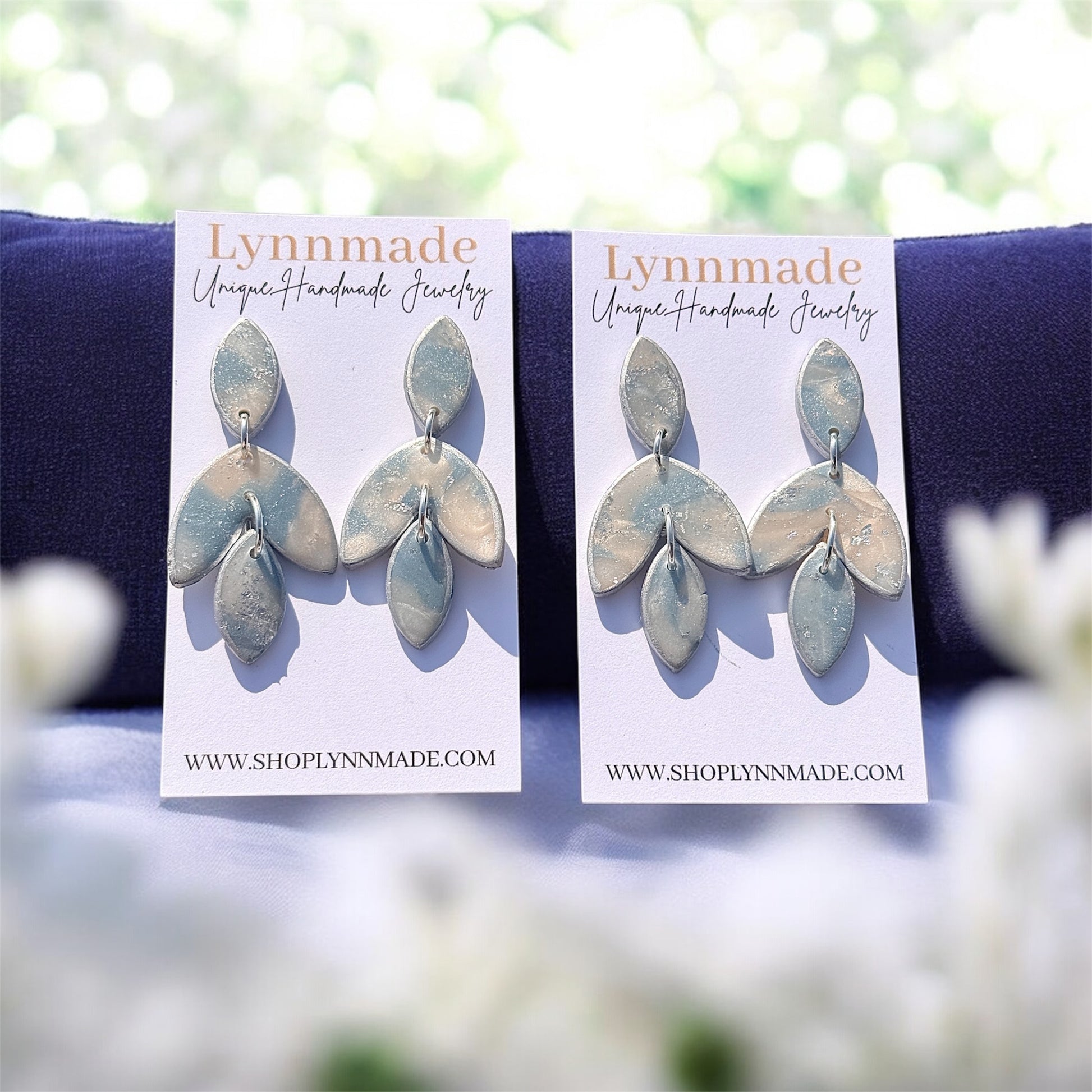 The bridesmaids’ earrings feature a soft dusty blue marbled clay design blended with hints of translucent white. The bride’s earrings are crafted with sparkling white marbled clay.
