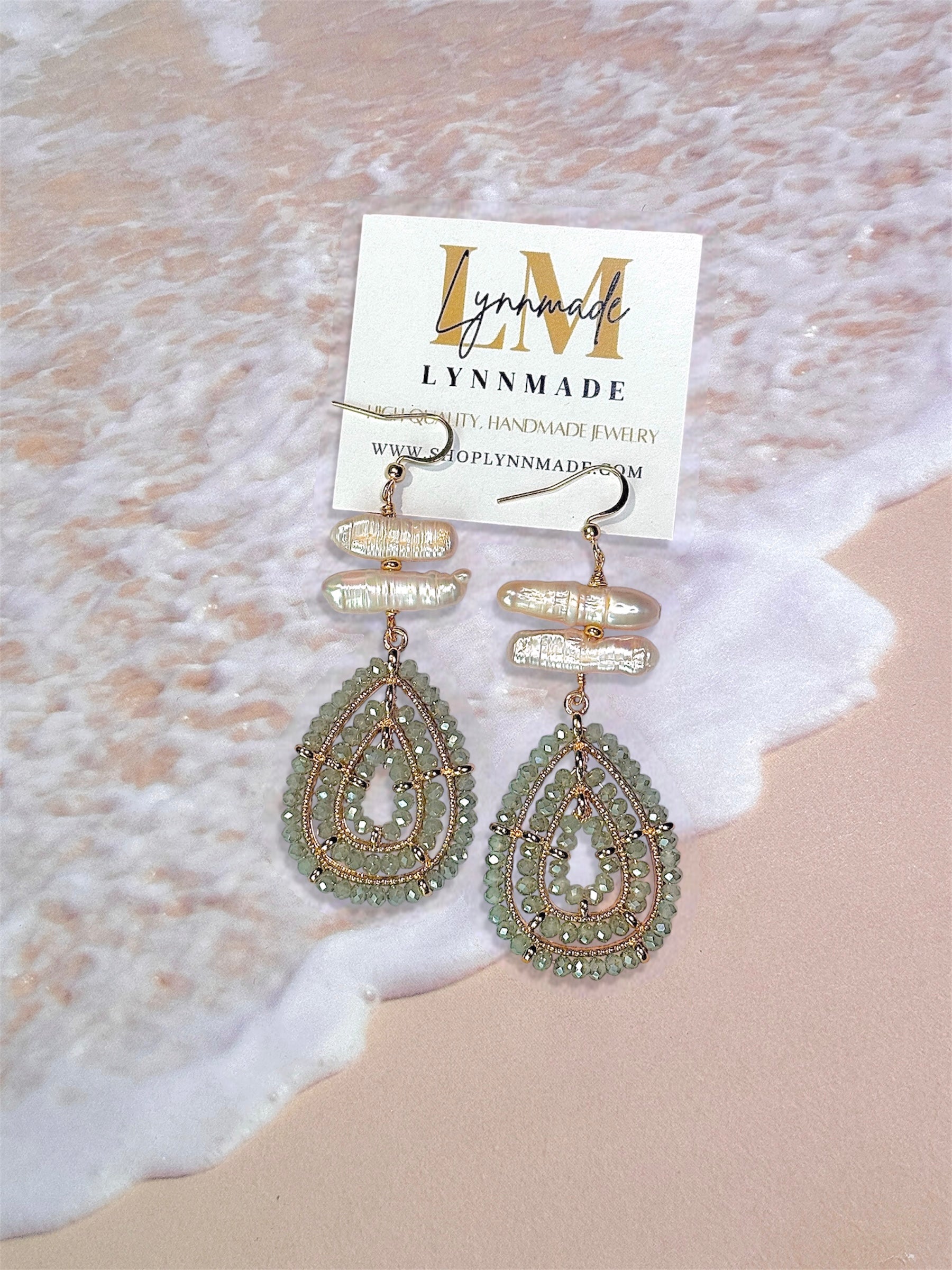 Handmade statement drops featuring lustrous stick pearls atop an intricate teardrop design of shimmering beads and 18k gold accents, inspired by the elegance of the sea.