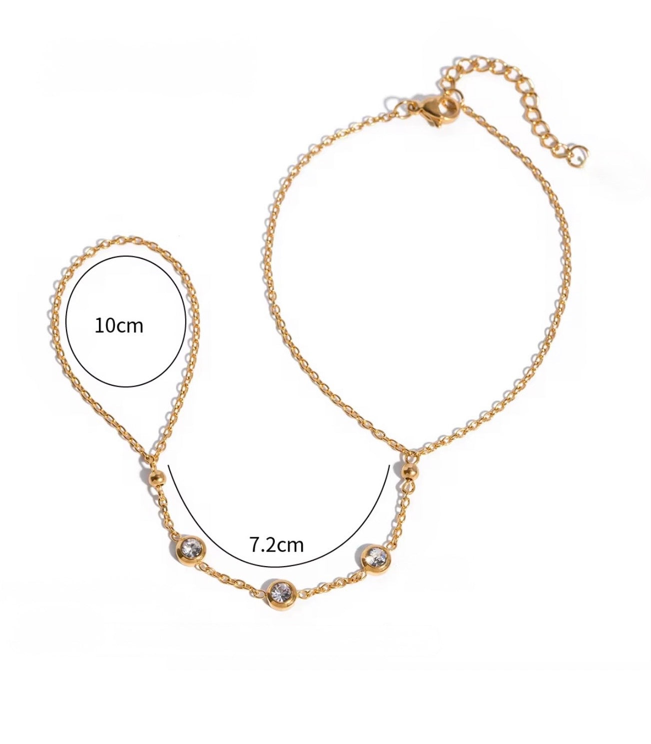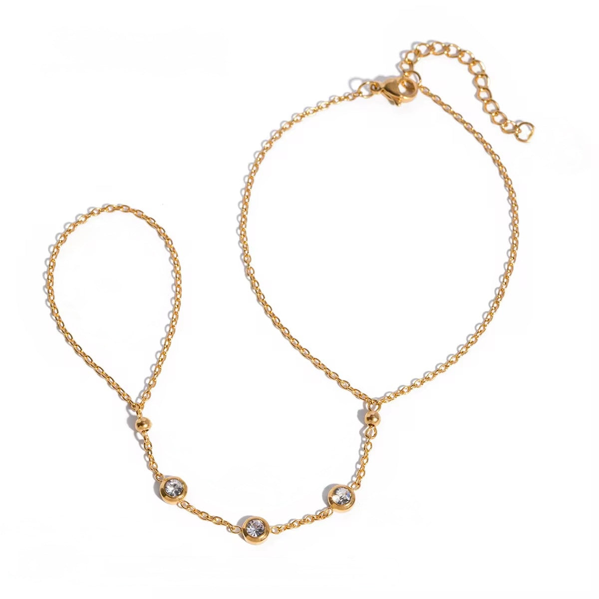 Luxurious bezeled zircon stones are attached to a waterproof, tarnish-free, and high-quality hand chain.